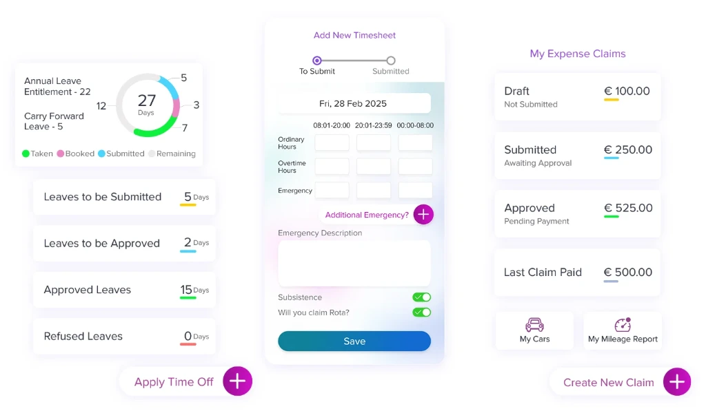 Empower your workforce with a modern mobile app that puts HR tools in their hands. Employees can check in, view payslips, request leave, submit expenses and access documents anytime. Everything your team needs, right on their phones: